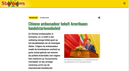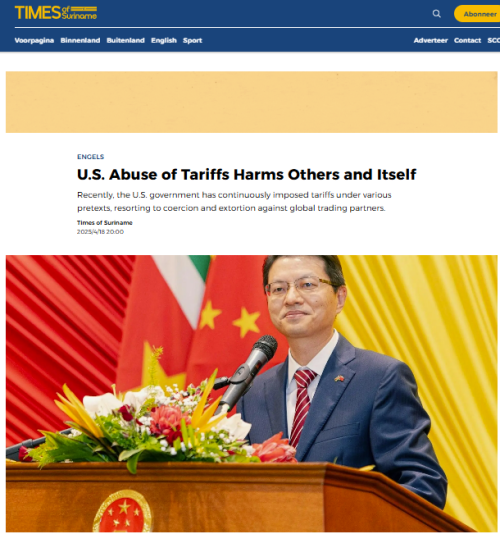2025年4月18日,驻苏里南大使林棘在苏里南发行量最大的报纸《苏里南时报》发表署名文章《美国滥施关税损人害己》,该文并获苏最大网络媒体“星网”援引,全文如下: