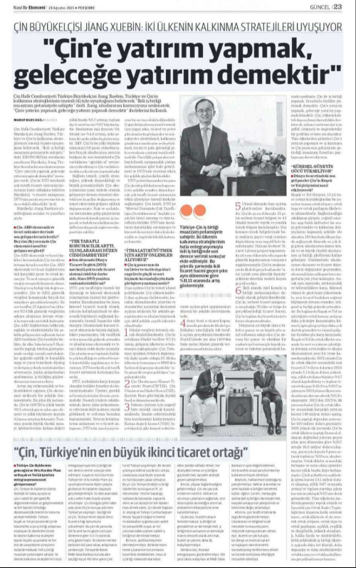 2025年8月28日,土耳其《经济报》发布对驻土耳其大使姜学斌的书面专访,姜大使围绕中美经贸谈判、中国经济、“一带一路”倡议和中土关系等议题回答记者提问。专访内容整版刊登于该报纸及网站,全文如下: