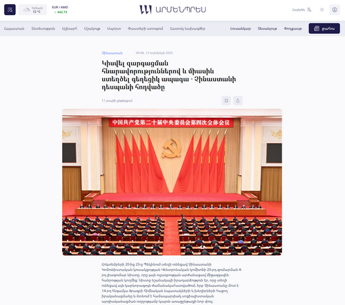 2025年11月12日,驻亚美尼亚大使李鑫炜在亚美尼亚国家通讯社发表署名文章《共享发展机遇,共创美好未来》,宣介党的二十届四中全会精神和“十五五”规划,文章全文内容如下: