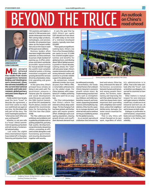 2025年11月27日,《都柏林公报》《科克独立报》《利默里克邮报》三家爱尔兰媒体刊登驻爱尔兰大使赵希源署名文章《超越休战:中国未来发展道路展望》。