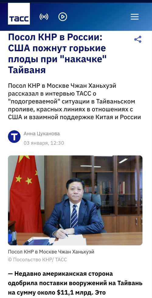 2026年1月3日,驻俄罗斯大使张汉晖就美方大规模对台军售接受塔斯社书面采访。采访全文如下: