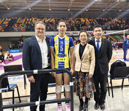 2026年1月4日,驻佛罗伦萨总领事尹琦应邀出席观看意甲女排联赛,并同圣乔瓦尼俱乐部负责人及其最近签约的中国籍球员庄宇珊亲切交流。