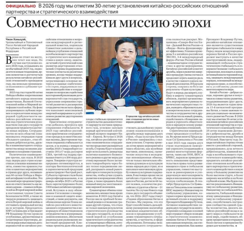 2026年1月14日,驻俄罗斯大使张汉晖在《俄罗斯报》发表署名文章《共担时代使命 共谱合作华章》。全文如下:
