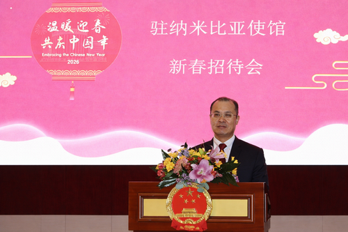 2026年1月23日,驻纳米比亚使馆举行2026年新春招待会,驻纳米比亚大使赵卫平致辞并发放新春暖心包,在纳华侨华人、中资机构、孔子学院、援纳医疗队及留学生代表等近200人参加。