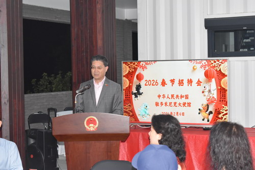2026年2月4日,驻多米尼克大使储茂明偕夫人出席使馆举办的2026年春节招待会,在多华侨华人、中资机构、援多医疗队和农业技术组专家、孔子课堂代表等100余人欢聚一堂,共迎新春。