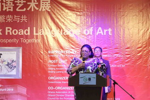 2019年4月6日,加纳大学新近落成的孔子学院大楼内灯火通明,人头攒动,一派节日景象,“2019丝路画语艺术展”开幕式正在这里举行。驻加纳大使王世廷、加纳第一夫人瑞贝卡·阿库福-阿多、加纳旅游、艺术和文化部副部长兹比利姆·巴瑞·伊迪、加纳驻华大使爱德华·博阿滕、外交部总司长阿尔伯特·扬基大使,中国行为法学会代表团团长张宝欣、格林豪斯国际(加纳)集团公司总经理高建等出席并致辞。加纳社会各界知名人士、著名画家代表、加纳大学师生、媒体记者及侨界代表等三百余人出席。