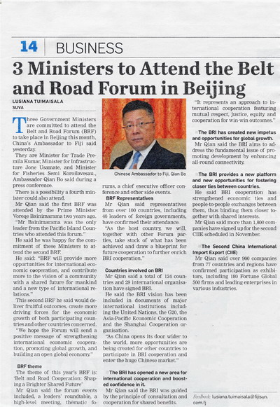 2019年4月9日,驻斐济使馆举行媒体吹风会,邀请斐济主流媒体《斐济太阳报》、《斐济时报》、斐济广播公司、玛宜电视台、斐济村网以及《斐济日报》(中文)、新华社驻斐记者参加。驻斐济大使钱波就第二届“一带一路”国际合作高峰论坛等我重大外交活动向中外媒体吹风。