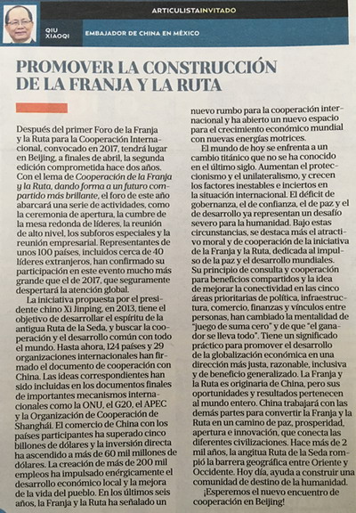 2019年4月7日,《墨西哥先驱报》刊登驻墨西哥大使邱小琪署名文章——《推动共建“一带一路”行稳致远》。文章指出,第二届“一带一路”国际合作高峰论坛将于4月下旬在北京举行。本届论坛以“共建‘一带一路’、开创美好未来”为主题,设开幕式、领导人圆桌峰会、高级别会议、专题分论坛以及工商企业家大会等系列活动。将有近40位各国领导人在内的上百个国家代表与会,较首届规格更高,规模更大,必将成为全球瞩目的又一场盛会。文章全文如下: