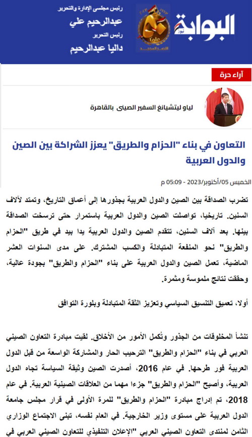 为庆祝“一带一路”倡议提出十周年,驻埃及大使廖力强在埃及主流媒体发表系列署名文章,结合共建“一带一路”丰硕成果深入宣介阐释习近平总书记提出的中国倡议、中国主张、中国方案,生动阐述共建“一带一路”的积极进展和重要意义。2023年10月5日,系列署名文章第四篇《中阿在共建“一带一路”中成为更紧密伙伴》在“门户网”发表。全文如下: