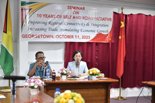 2023年10月11日,驻圭亚那使馆与圭亚那切迪·贾根研究中心共同举办“一带一路”十周年研讨会。驻圭亚那大使郭海燕、圭前总统拉莫塔、前外长格里尼奇、圭中友协副会长佩尔绍德、孔子学院圭方院长克雷顿分别发言,圭外交部、内政部官员以及学者、青年、商界代表和部分驻圭使节出席。