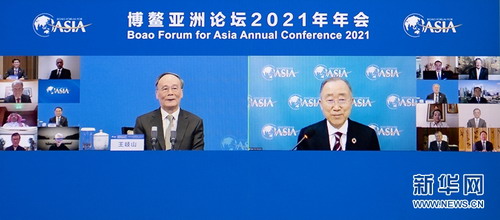 2021年4月20日,国家副主席王岐山在海南博鳌出席博鳌亚洲论坛2021年年会开幕式,集体会见论坛理事和战略合作伙伴,并同中外企业家代表座谈。