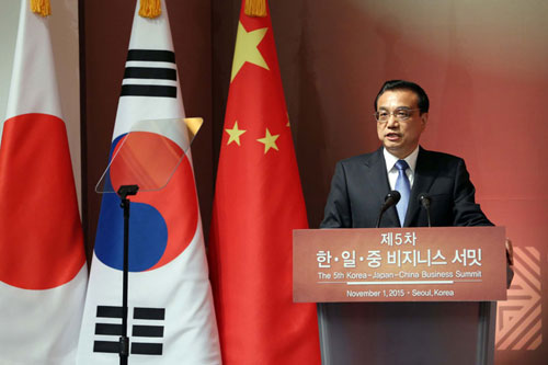当地时间11月1日下午,国务院总理李克强与韩国总统朴槿惠、日本首相安倍晋三在首尔共同出席第五届中日韩工商峰会。