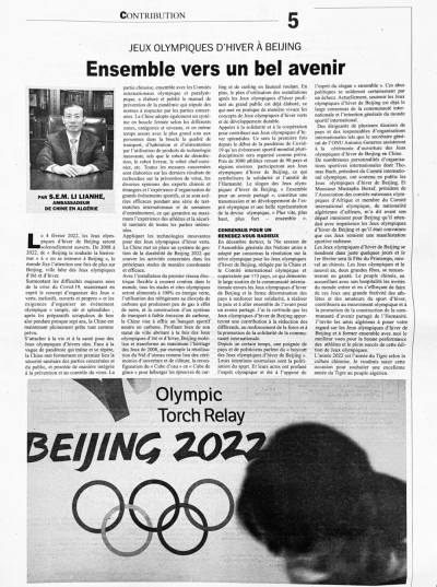 2022年1月30日,驻阿尔及利亚大使李连和在阿尔及利亚主流媒体《独立青年报》发表题为《情聚北京冬奥,相约美好未来》的署名文章,宣介2022年北京冬奥会。文章从“绿色、共享、开放、廉洁”的办奥理念和“简约、安全、精彩”的办赛要求出发,介绍了本次冬奥会安全、绿色、团结三大亮点,强调反对体育政治化,支持北京冬奥会已经成为国际社会的普遍共识和国际体育界的共同心声,邀请阿尔及利亚人民共同为各国运动员加油鼓劲,并祝愿北京冬奥会取得圆满成功。文章全文如下: