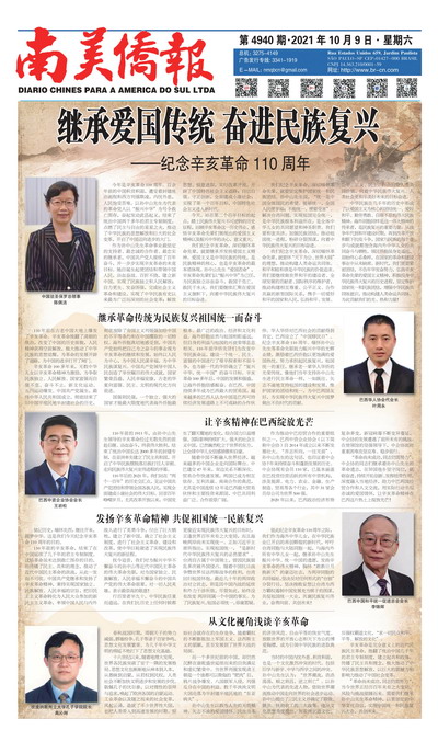 2021年10月9日,南美地区最大华文日报《南美侨报》发表纪念辛亥革命110周年特刊。驻圣保罗总领事陈佩洁及领区中资企业和华人华侨代表重温辛亥革命前辈的丰功伟绩,坚定支持国家统一,展望民族复兴伟大前景。
