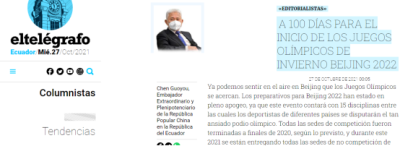 2021年10月27日,在北京2022年冬奥会开幕倒计时100天之际,驻厄瓜多尔大使陈国友在厄主流媒体《电讯报》发表题为《北京2022年冬奥会开幕倒计时100天》的署名文章。
