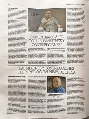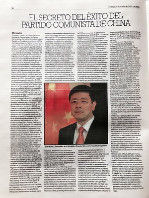 2021年10月24日,阿根廷《侧影报》以整整4个版面刊发驻阿根廷大使邹肖力等撰写的7篇宣介《中国共产党的历史使命与行动价值》重要文献专题文章,这是驻阿根廷使馆联合阿主流媒体为庆祝中国共产党成立100周年举办的又一大型活动。