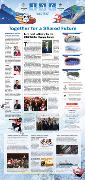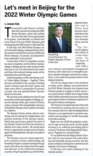 2021年10月27日,美国历史悠久的地方主流媒体《费城问询报》刊发“一起向未来”北京冬奥会倒计时100天特刊。驻纽约总领事黄屏为特刊撰写题为《相约中国北京,共襄冬奥盛会》的署名文章。