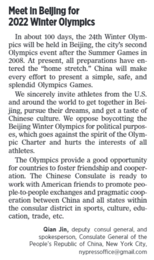 该报评论版同日同期刊发总领馆发言人有关表态,介绍中国冬奥会各项准备工作已经就绪,中国将向世界呈现一届简约、安全、精彩的冬奥会,欢迎美国冬奥健儿齐聚北京实现冬奥梦想,坚决反对将体育运动政治化的错误言行,并展望与领区各界深化交流合作的良好愿景。