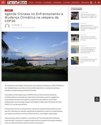 2021年10月29日,驻圣多美和普林西比大使徐迎真在圣多美和普林西比新任总统率团出席联合国气候变化大会、当地媒体予以广泛报道之际,在非屏(Téla-Nón)、透明报(Transparência)、热带报(Tropical)等当地媒体上发文,展望气候变化大会成果,宣介中方应对气候变化举措,并呼吁中圣普加强该领域合作。