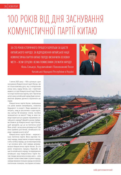 2021年10月27日,驻乌克兰大使范先荣在乌主流媒体《基辅外交官》杂志年刊上发表了题为《中国人民隆重纪念中国共产党诞辰100周年》的署名文章,进一步对外宣介中国共产党故事。