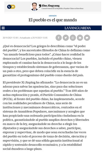 2021年11月25日,驻巴塞罗那总领事朱京阳在西班牙主流媒体《先锋报》发表署名文章——《坚持以人民为中心的发展思想》。文章主要内容如下: