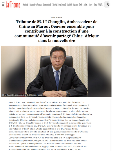 2021年12月1日,驻摩洛哥大使李昌林在摩主流周刊《新论坛》发表题为《书写构建新时代中非命运共同体的新篇章》的署名文章,介绍中非合作论坛第八届部长级会议有关情况和成果举措。主要内容如下: