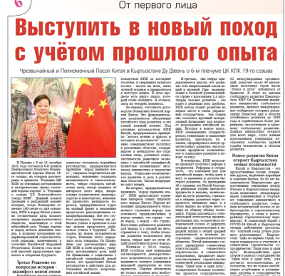 2021年12月3日,驻吉尔吉斯斯坦大使杜德文在吉官方媒体《吉尔吉斯斯坦言论报》发表题为《继往开来踏上奋斗新征程》署名文章,宣介中国共产党第十九届中央委员会第六次全体会议精神。
