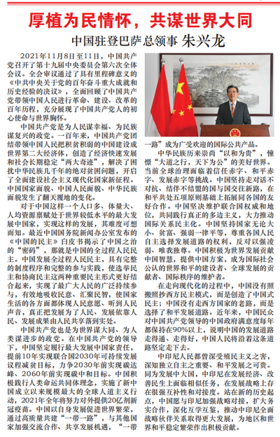 2021年12月8日,驻登巴萨总领事朱兴龙在印尼主流华文媒体《国际日报》和《千岛日报》上发表署名文章《厚植为民情怀,共谋世界大同》,简要介绍中国共产党第十九届中央委员会第六次全体会议和《中国的民主》白皮书相关成果。