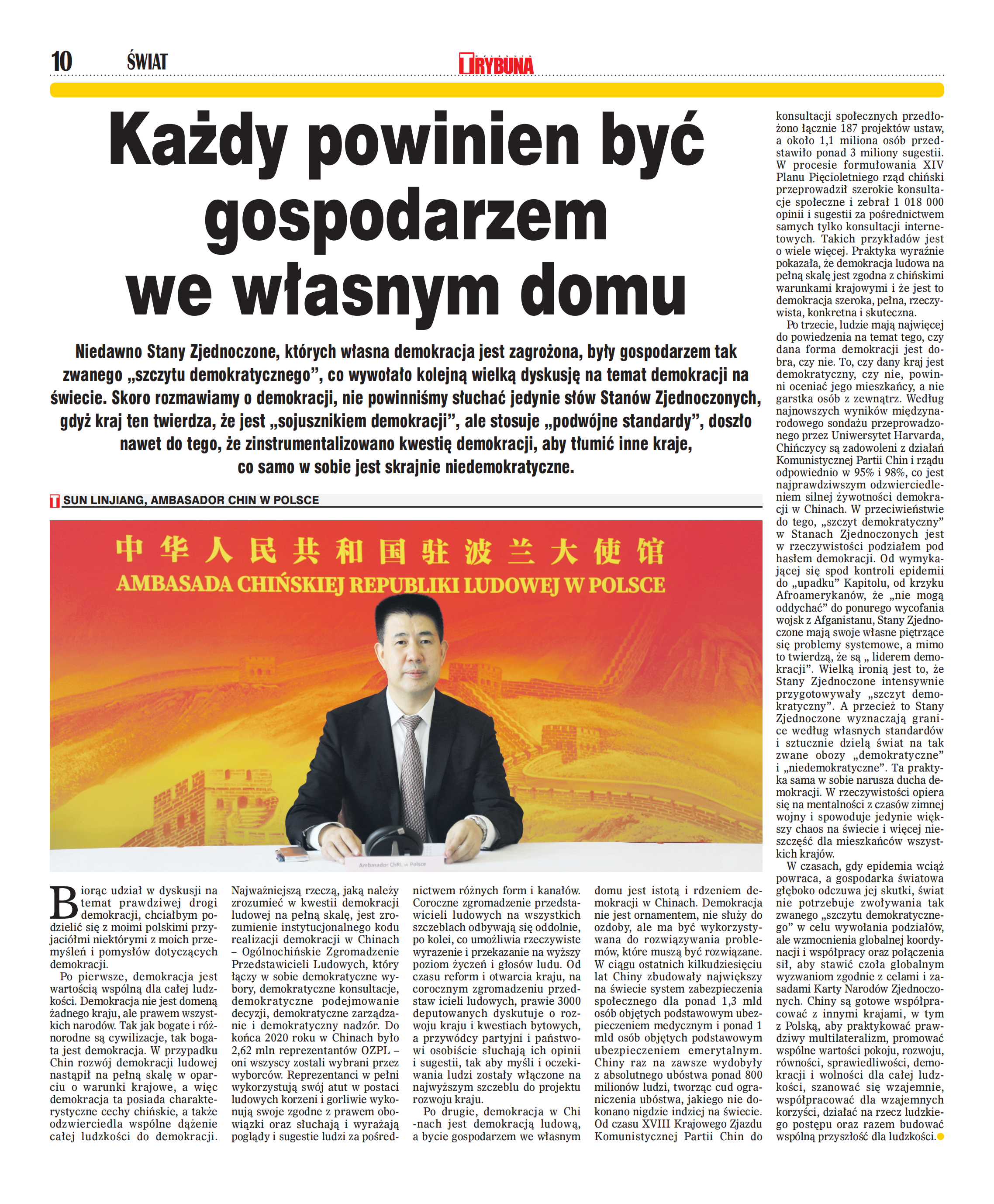 2021年12月9日,驻波兰大使孙霖江在波《论坛报》发表署名文章《为了人民当家作主》,积极宣介全过程人民民主理念和中国民主发展成就,深刻揭批美自身民主劣迹及借举办所谓“民主峰会”搞分裂对抗的反民主行径。该报网站同步全文刊登。