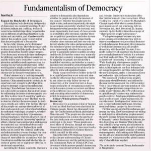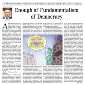 2021年12月10日,驻孟加拉国大使李极明在孟加拉国主流英文报纸《每日太阳报》发表《中国良治之文化溯源》随笔专栏系列文章之二十四——《民主原教旨主义可以休矣》。文章概要如下: