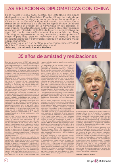 2023年2月3日,驻乌拉圭使馆与乌主流媒体《共和国报》合作发行特刊,热烈庆祝中乌建交35周年。驻乌拉圭大使王刚、乌前总统桑吉内蒂、拉卡列、外长布斯蒂略、牧农渔业部长马托斯、参议员达席尔瓦、派桑杜省前省长卡拉瓦略、驻华大使卢格里斯、国际合作署、国家农牧业研究院、共和国大学副校长蒙布鲁、孔子学院乌方院长言长冠、乌拉美社科院院长费尔南德斯、乌中文化交流中心主任奥夫雷贡、乌中文化学院院长释延文、乌中商会董事会、科拿乳业首席执行官巴尔德斯、环球咨询公司首席执行官马丁内斯、蒙市“中华人民共和国小学”校长莫雷拉、里维拉省“中华人民共和国小学”校长多纳斯西门托、蒙市城市电视台记者德尔加多、上海大学博士生张哲海夫妇、复旦大学中国哲学硕士罗索、造型艺术家里埃伊洛、中华会馆主席陈炎国、华人协会、中国机械设备工程股份有限公司乌拉圭500kV输变电环网闭合项目、华为乌拉圭公司总经理谢宇翔、中远海运集运(乌拉圭)有限公司等发表文章或贺词。27版特刊图文并茂、内容丰富,从政治、经贸、教育、文化、科技、新闻、学术、艺术、民间友好等各个角度全面展现了中乌战略伙伴关系的高水平和丰富内涵,在当地引起热烈反响。