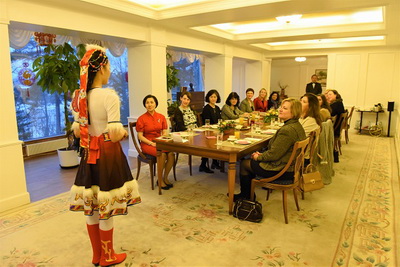 2017年1月18日下午,驻芬兰大使官邸高高挂起大红灯笼,贴上喜庆的鸡年生肖窗花,在一片喜气洋洋中欢迎国际友人们到馆做客。今天,大使夫人秦飒为驻芬使节夫人举办茶会,在清新的茶香中,欣赏中国民族民间舞蹈,品味中国传统文化的魅力。