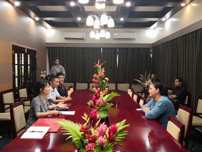 2020年10月15日,驻密克罗尼西亚联邦大使夫人赵迎光与中铁十四局驻密项目组前往总统府,代表中国使馆向第一夫人办公室捐赠文体用品。总统夫人帕特里夏·埃德温、外交部副部长布兰迪、中铁项目组现场负责人胡纪国等出席。