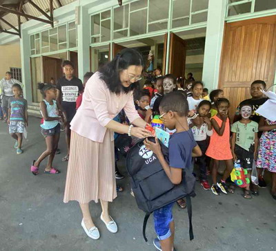 颁奖仪式结束后,王菊参赞赶往路易港唐克巴尔地区,与华社联盟共同向该地区100多名贫困儿童分发书包、水杯等学习和生活用品作为新年礼物。王菊参赞向孩子们送上新年祝福,希望他们在新的一年里继续努力学习、快乐成长。