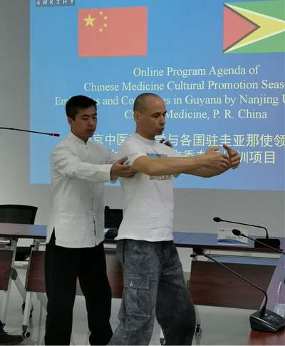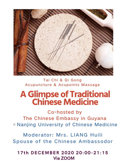 2020年12月17日,驻圭亚那使馆妇女小组举办线上中医文化讲座,邀请南京中医药大学专家进行讲授,驻圭亚那大使夫人梁慧丽致辞,圭外交部礼宾司司长夫人、各界友好知名人士、驻圭外交使团、援圭医疗队、孔子学院代表等近40人参加。
