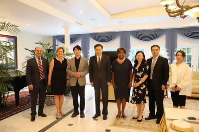 2021年9月17日,驻美国大使秦刚会见美国肯尼迪表演艺术中心总裁鲁特、副总裁亚当斯、美国国家交响乐团团长金斯特林以及应邀来美访演的中国钢琴家郎朗一行。