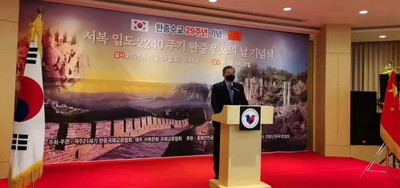 2021年11月30日,驻济州总领事王鲁新出席“纪念徐福登岛2240周年——中韩友好日”活动,济州21世纪韩中国际交流协会会长姜永植、济州徐福文化国际交流协会理事长李英根、济州道前知事金泰焕、西归浦市副市长韩雄、济州道议会议员李京容、姜忠龙及济州友好人士代表等40余人出席。