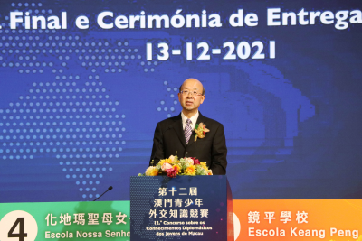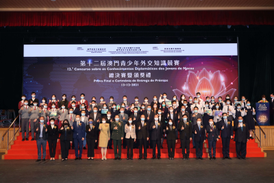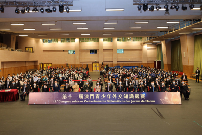 第十二届澳门青少年外交知识竞赛吸引了特区34所中学近万名学生积极参与。总决赛现场气氛紧张热烈,8支参赛队伍在选择题、填空题、抢答题环节展开激烈角逐,在论述题环节采用情景剧、弹唱、PPT演示等多种形式,对有关外交议题进行生动讲解,赢得现场阵阵掌声。最终,教业中学、培正中学、镜平学校、圣公会(澳门)蔡高中学脱颖而出,分获冠、亚、季、殿军,化地玛圣母女子学校、濠江中学、澳门大学附属应用学校、广大中学获优异奖。