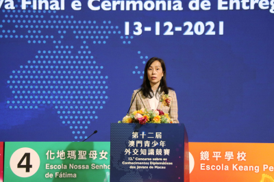 欧阳瑜司长在致辞中表示,外交知识竞赛有力增进了澳门青年学子对中国特色大国外交、国家发展、国际形势了解。当前,百年变局与世纪疫情叠加共振,各国人民对和平发展、合作共赢更为期待,习近平主席提出的人类命运共同体理念深入人心。希望同学们勤加思考,积极武装自己,把握机遇,主动融入和参与国家建设,成为推动社会发展的重要力量。特区政府将继续与外交部驻澳门公署紧密合作,帮助同学们了解国家发展,增强家国情怀,拓宽国际视野,为将来贡献国家、贡献澳门发展打好基础。