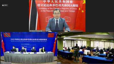 2021年12月13日,驻特立尼达和多巴哥大使方遒在线出席中国-特多社会安全治理研修班线上开幕式。广东清远市副市长、公安局长雷虎、广东省公安厅国合处处长严波,特多助理警察总监贝尔芬以及20名特多参训学员参加。