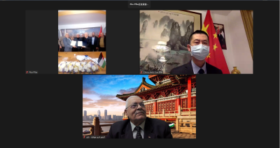 2021年12月20日,驻巴勒斯坦办事处主任郭伟出席巴中友好协会与巴勒斯坦企业家协会合作谅解备忘录签署仪式。法塔赫中国事务部长扎齐、巴中友协会长阿德南、巴企业家协会会长阿姆尔、巴驻华大使马赫达维出席。