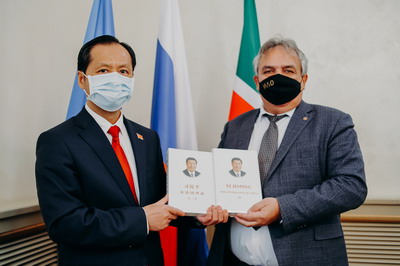 吴颖钦总领事向喀山联邦大学赠送一批图书,其中包括《习近平谈治国理政》第三卷(中、英文版)和习近平《论坚持推动构建人类命运共同体》(俄文版)。吴总领事表示,《习近平谈治国理政》第三卷收录了习近平主席在2017年10月18日至2020年1月13日期间的重要著作,分为19个专题,有助于读者更好理解习近平主席推进新时代治国理政的实践,具有丰富思想内涵和重大意义。构建人类命运共同体,实现共赢共享是保障世界和平与发展的中国方案。在两国元首战略引领下,中俄为推动建设新型国际关系、构建人类命运共同体树立了典范。希望喀山联邦大学汉语专业学生学好汉语,领略中华优秀传统文化,在中俄友好和中国经济腾飞、社会发展的时代背景下实现个人理想,促进中俄文化交流,让大国之间友谊薪火相传。