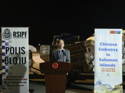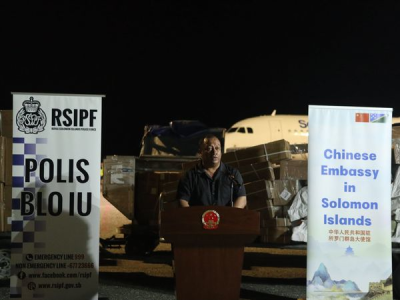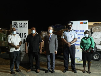 2021年12月29日晚,中国政府援助所罗门群岛政府首批警用物资运抵所首都霍尼亚拉。驻所罗门群岛大使李明、所代理警察部长帕纳基塔斯、警察部常秘加洛凯勒、外交部常秘贝克、警察总监曼高等赴机场迎接。