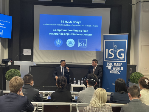 2022年3月4日,驻法国大使卢沙野应邀出席巴黎联合国校际委员会(CINUP)在法国高等管理学院(ISG)举办的“面对重大国际挑战的中国外交”专场交流活动。ISG校长塞巴格、CINUP主席吉奥松及来自委员会成员高校的百余名学生现场参加活动。活动全程通过网络平台直播。