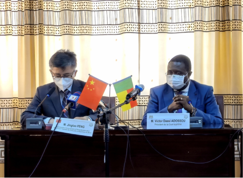2022年3月3日,驻贝宁大使彭惊涛在波多诺伏与贝宁最高法院院长阿多苏共同签署中国政府援贝宁最高法院会议视频播放系统项目执行协议。贝宁最高法院总检察长马都迭,贝宁最高法院司法庭庭长阿沃农、行政庭庭长高都、首席书记官周苏及最高法院主要负责人,中资企业代表等参加。