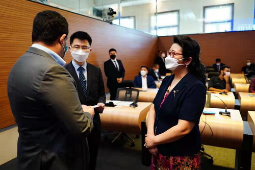 贾杜巴议长代表议会向严总领事献花,感谢总领馆长期以来为推动累市同中方友好交往提供的大力支持。双方并互赠中巴特色礼物。