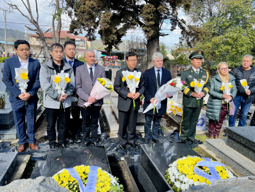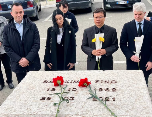 2022年清明节前夕,驻阿尔巴尼亚大使周鼎一行前往地拉那沙拉公墓,祭奠上世纪七十年代在援阿工作中牺牲的中国专家和工程技术人员。阿国家广电总台副台长奈齐里、阿中文化协会会长斯巴修及中资机构代表等出席。周大使带领中阿双方人员扫墓、献花、祭酒,向烈士们鞠躬致敬。