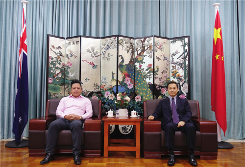 2022年4月21日,驻珀斯总领事龙定斌会见西澳大利亚澳中友好协会(简称“西澳澳中友协”)新任会长吴粤(Simon Wu),就加强中西澳友好交流合作尤其是筹办澳中全国友协2022年会、中澳建交50周年庆祝活动等议题深入交换意见。