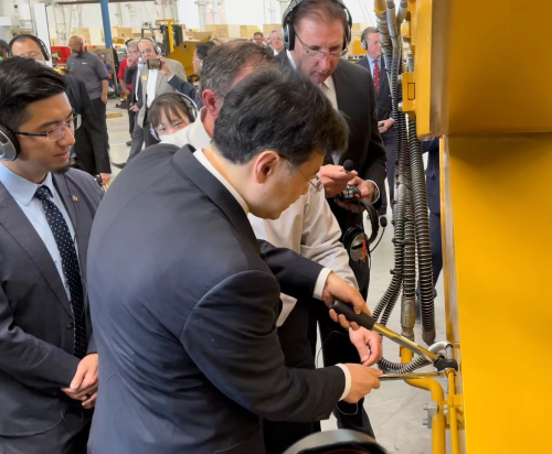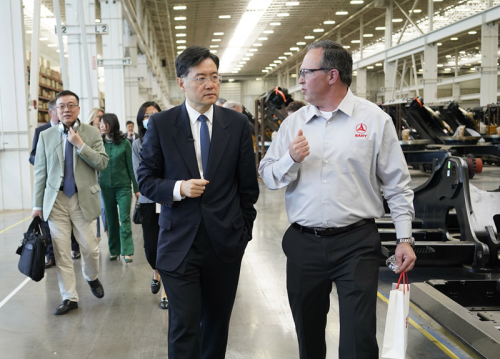 秦大使沿着工厂组装线一路参观,认真听取美方高管和工人讲解,不时提问并详细了解工厂组装流程、主要部件来源、市场动向、人员培训、员工福利、美基建政策和形势、交通运输、疫情对供应链和公司运营的影响等情况。弗瑞森和运营总监布雷特一一作答。布介绍说,美各州基建需求巨大,如联邦政府能尽早通过基建法案,将为工程机械带来巨大市场机遇。同时,美政府对中国产品施加25%税率的301关税导致进口部件成本上升,加重了公司负担,不得不采取一些额外措施弥补不利影响。