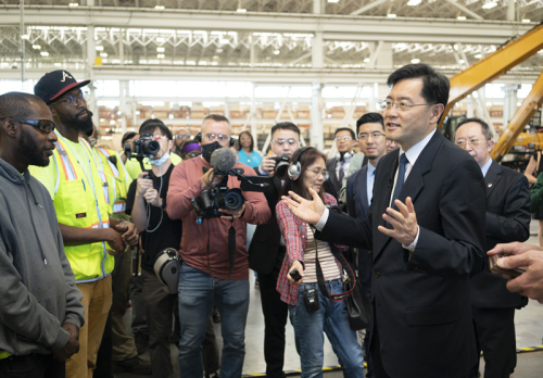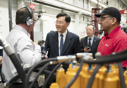 秦大使随后向工人发表即席讲话,并回答现场记者的提问。秦大使说,很高兴来到三一美国工厂与大家见面,了解到你们是如何高质量地完成每一件产品。中国公司的产品在美国生产,向全美销售并赢得好评,各方都从中受益。你们通过自己的辛勤劳动不仅生产出好产品,支持家庭,更亲身参与并向外界讲述了中美互利共赢的好故事,生动展示了中美两国利益交融的现实。两国人民都希望通过自身努力实现对更美好生活的向往,在这方面大有合作空间。美国正致力于开展基础设施建设,这将带来更多的市场机遇和订单。中美作为两大经济体又互为最重要的贸易伙伴之一,两国经贸关系的本质是互利共赢。作为中国驻美大使,我会继续做推动两国各界沟通了解的桥梁和纽带,拓展务实合作,让中美关系给两国民众带来更多实实在在的好处。